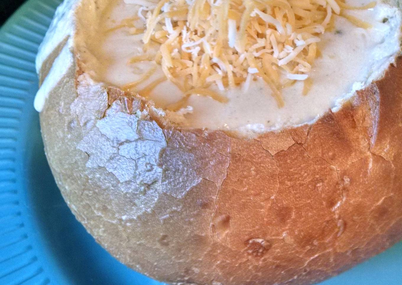 - Hollow out your bead bowl if you so desire and pour soup into it. Top with remaining shredded cheese.
