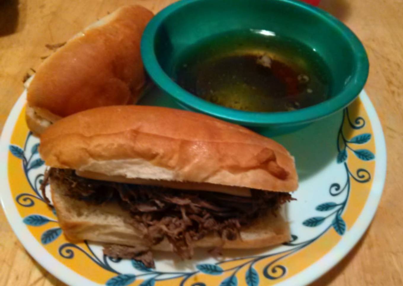 - Put shredded meat on bread, bun, or ciabatta, add cheese, serve with small cup of broth to dip in.