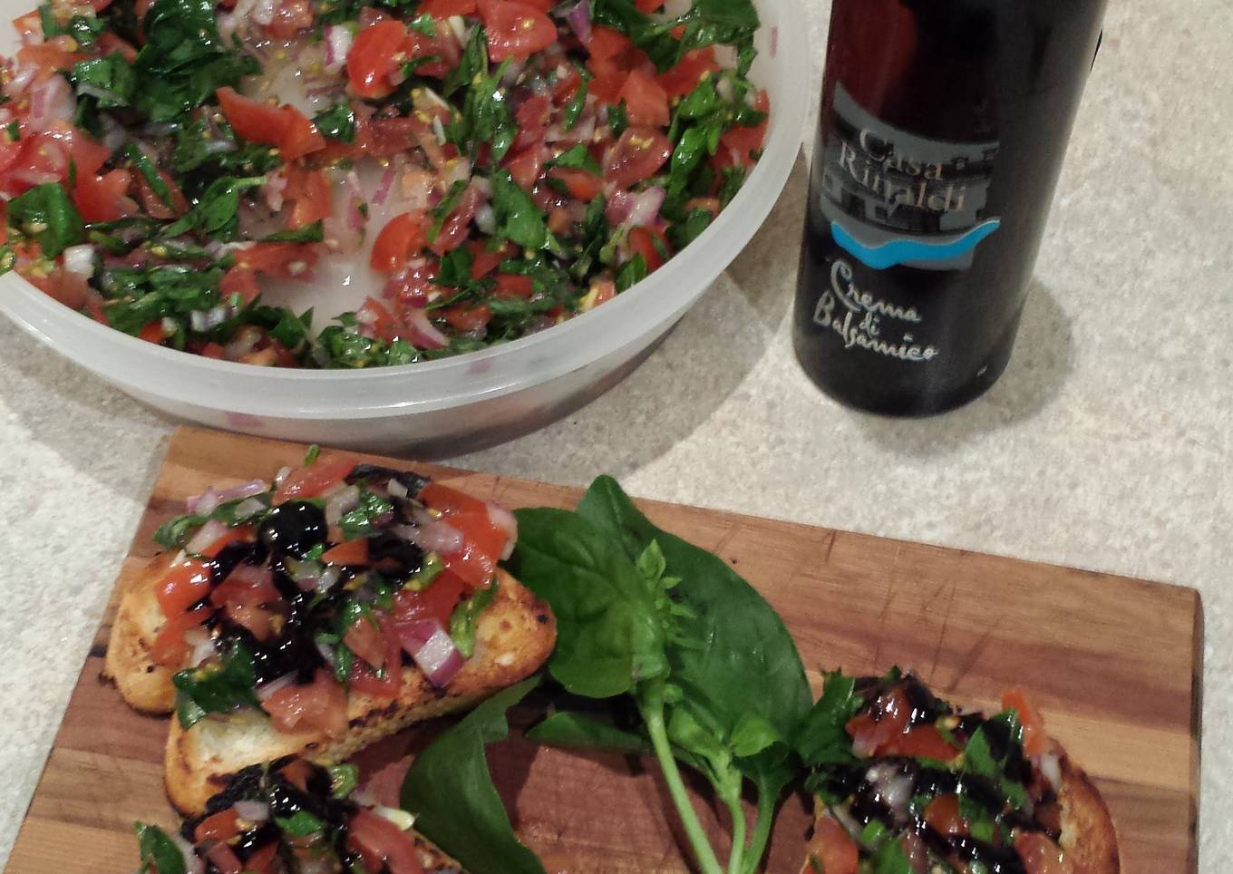 - 1/4 tsp thick balsamic vinegar to drizzle over top of each bruschetta