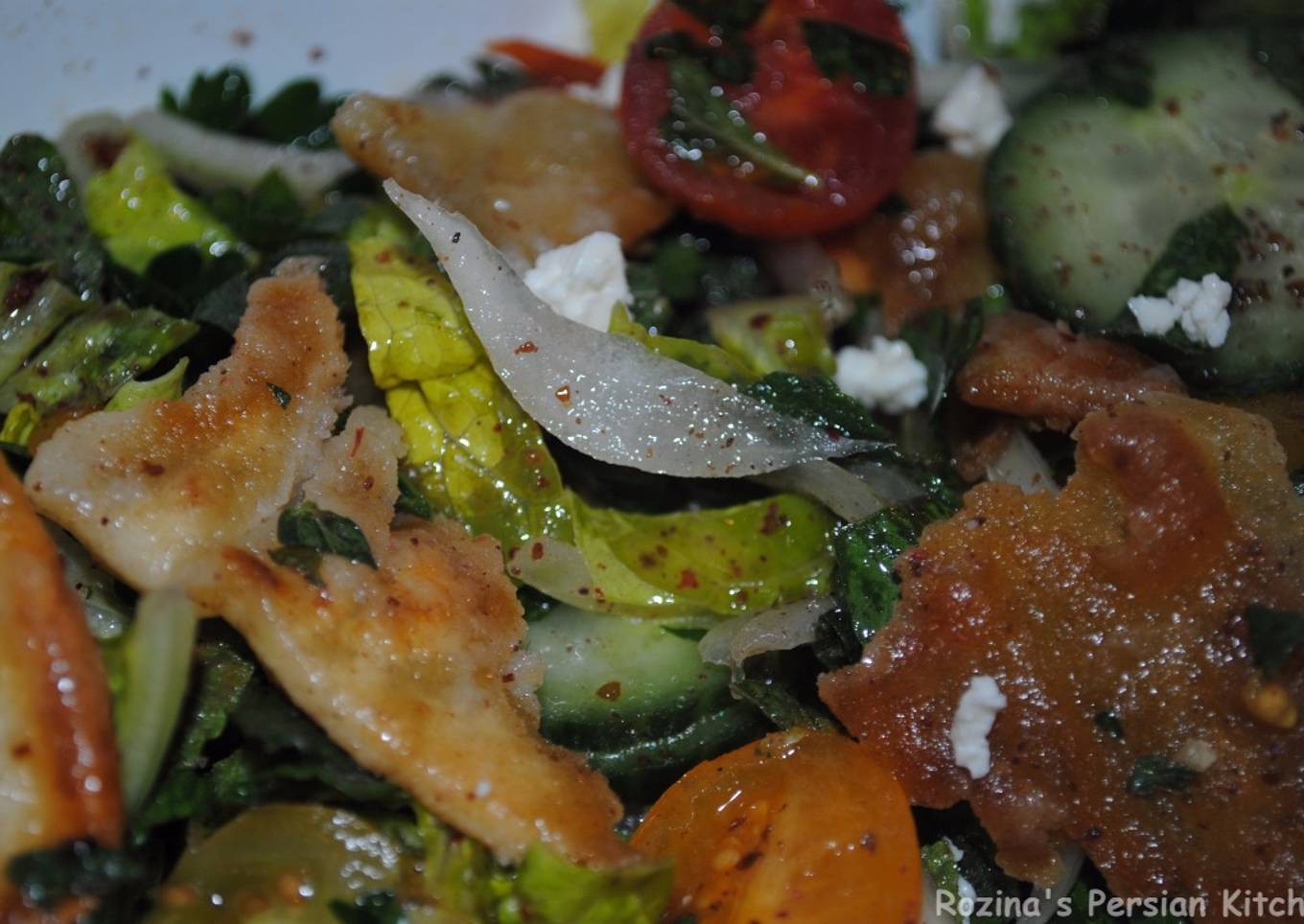 This refreshing salad made with fried pita or Lavash bread and freshly chopped herbs. In this salad ingredients cut or chop into large pieces. Using ground sumac and lemon juice and their combination with fried bread and chopped herbs create fresh, rich and tasty salad.