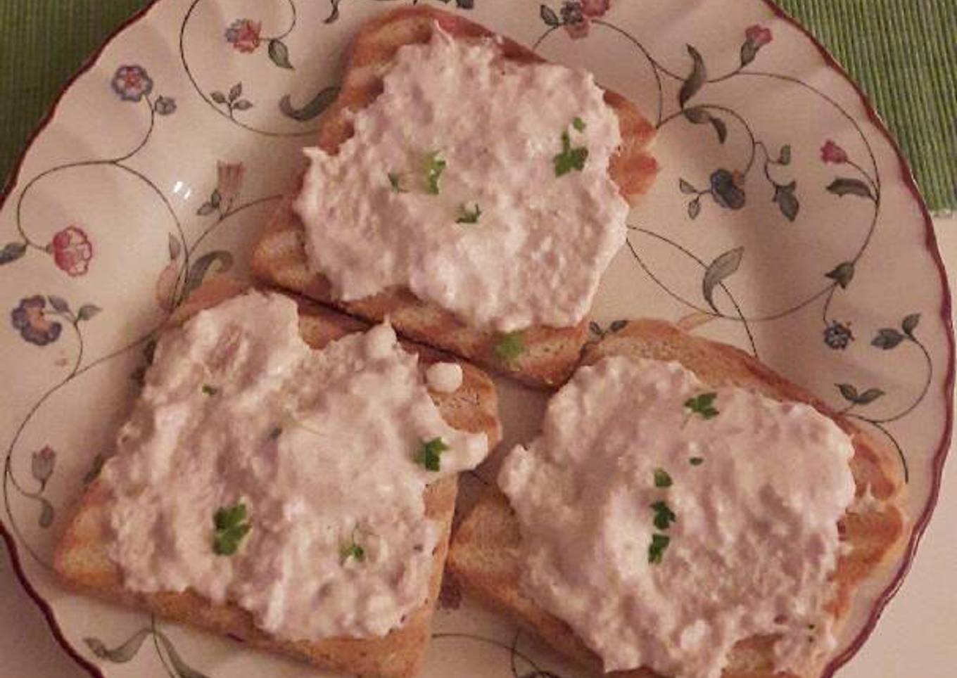 - In the bowl put tuna,youghurt or sour cream,salt,peper,garlic powder and a little bit of lemon juice.Mix it all together.Put it in the fridge for 10 minutes