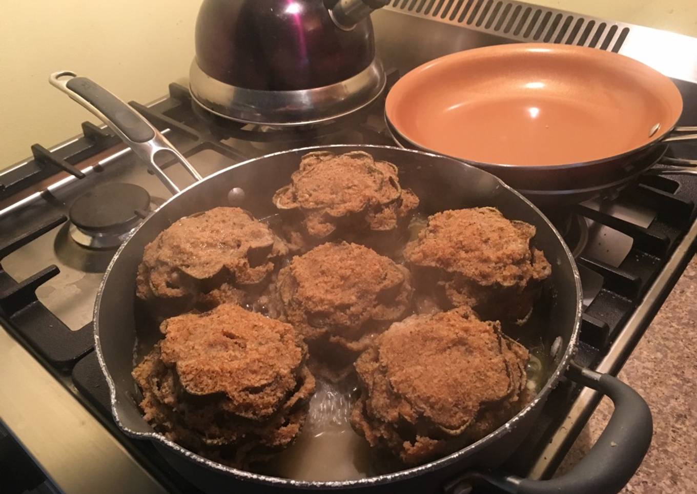 - Put the artichokes in the skillet and cover. On a low flame steam them for three hours ensuring you maintain the water level in the pot.