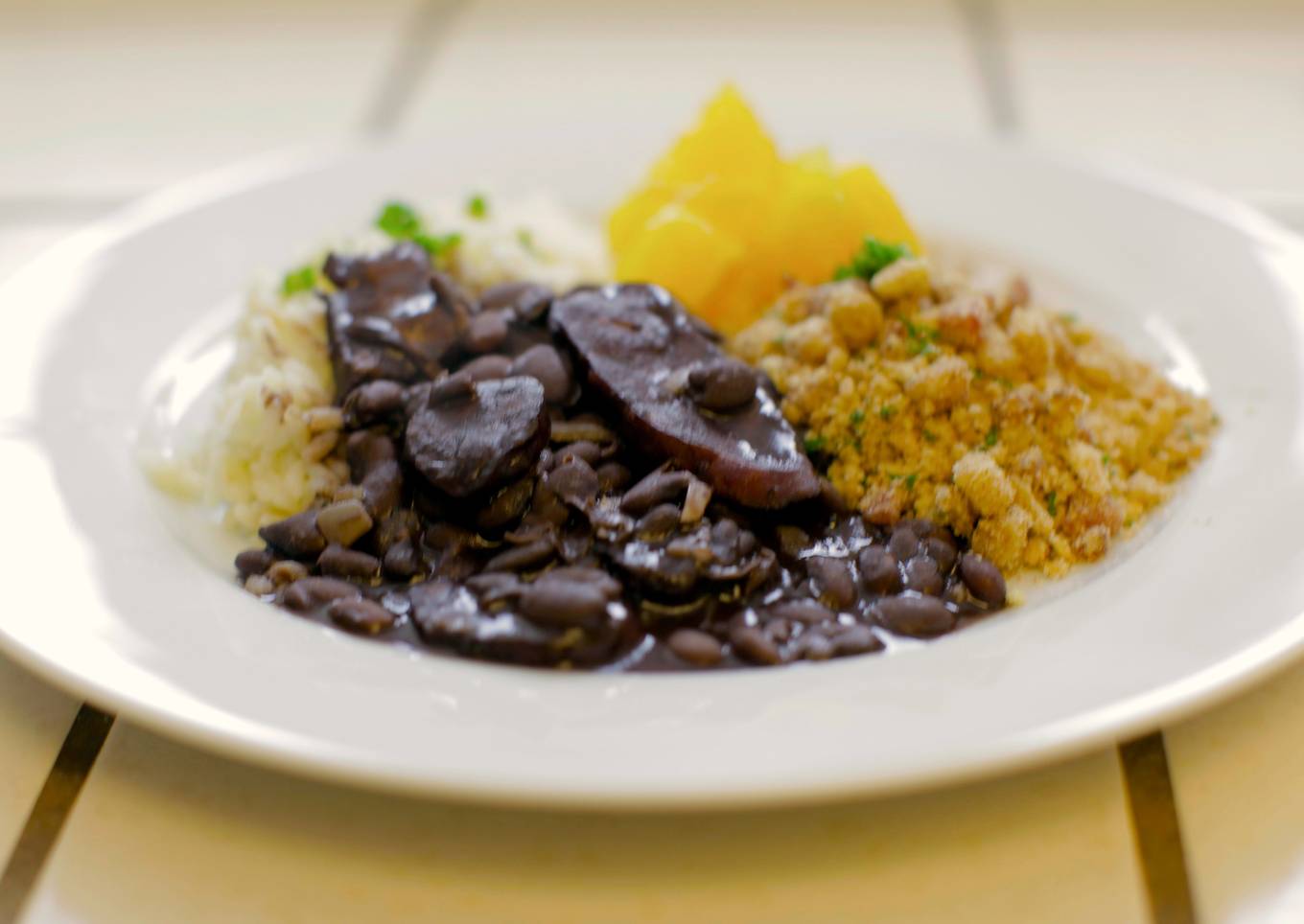 - In the plate, put rice, add beans on top. On the side put the Farofa and orange slices.