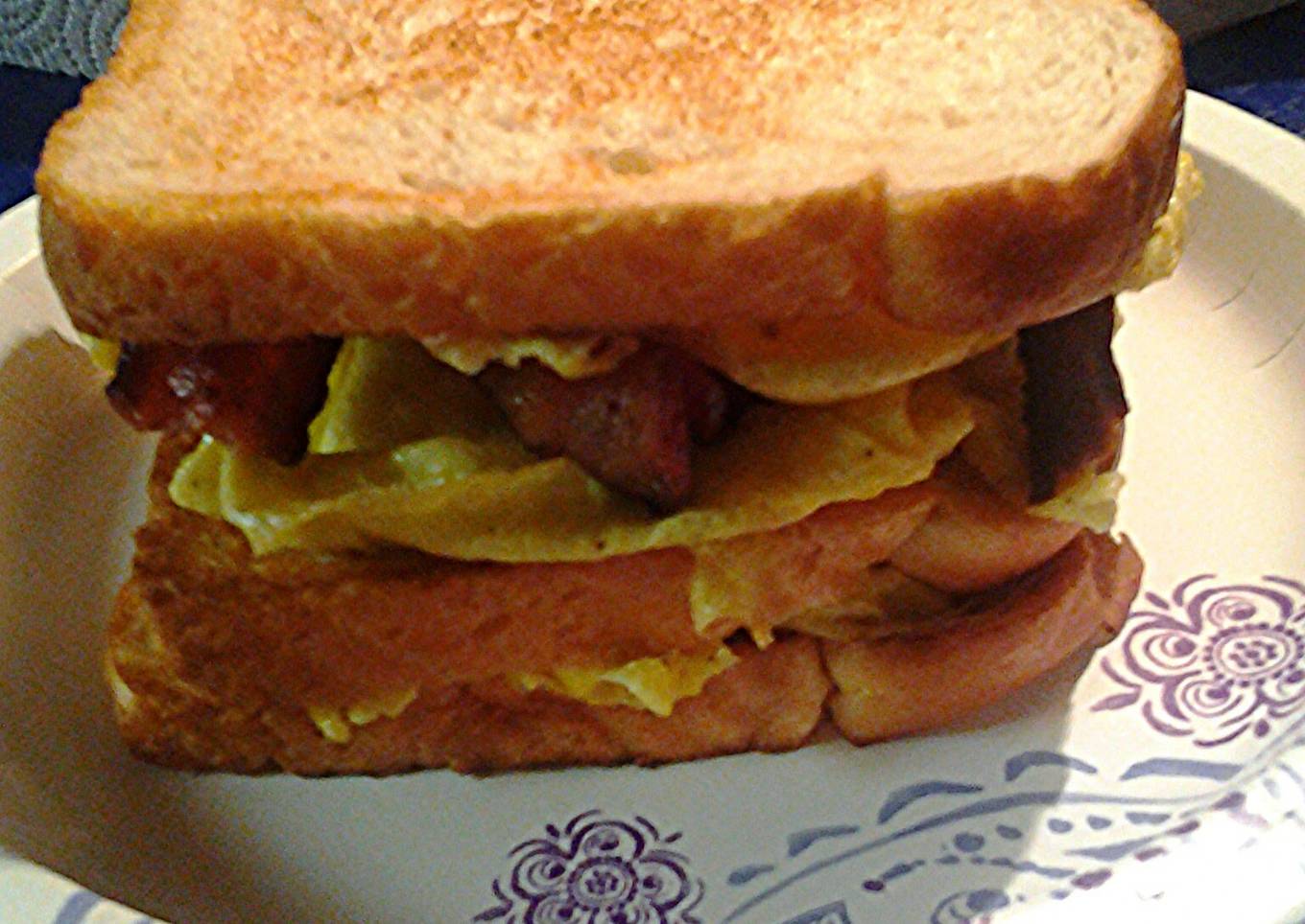 - Bread then egg, and bacon and mayonnaise top piece of bread mayonnaise side down enjoy