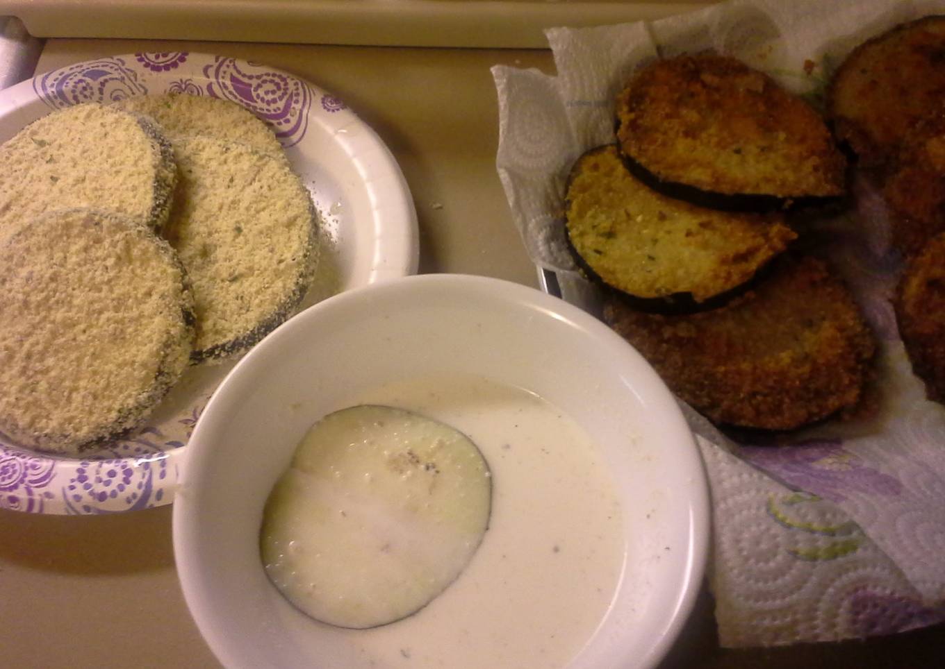 - Press each side of each slice of eggplant into the flour, then dip into the milk, then press into the crumbs. Place slices on a plate.