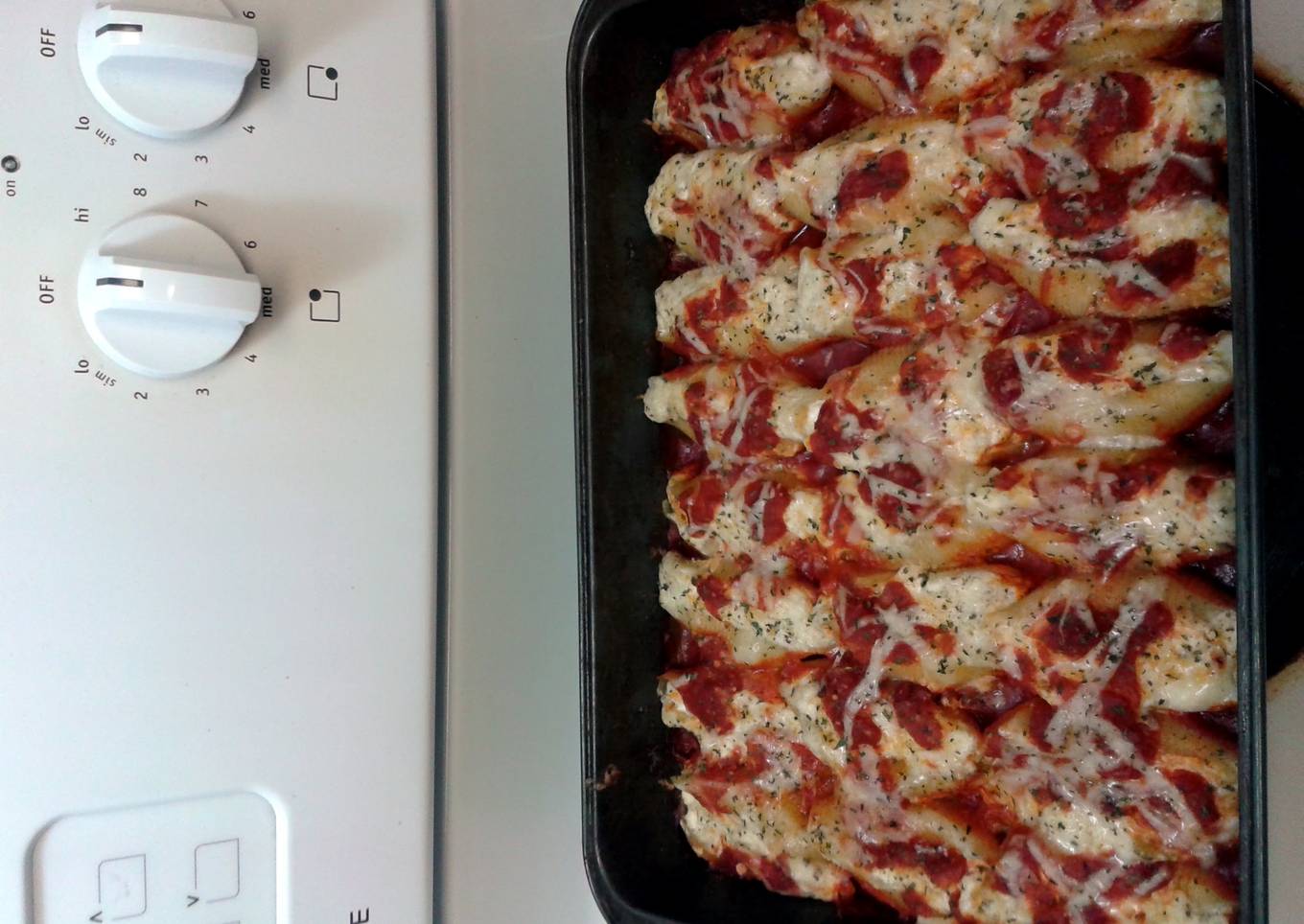 - When your pan is full pour the rest of your tomato sauce over the shells.