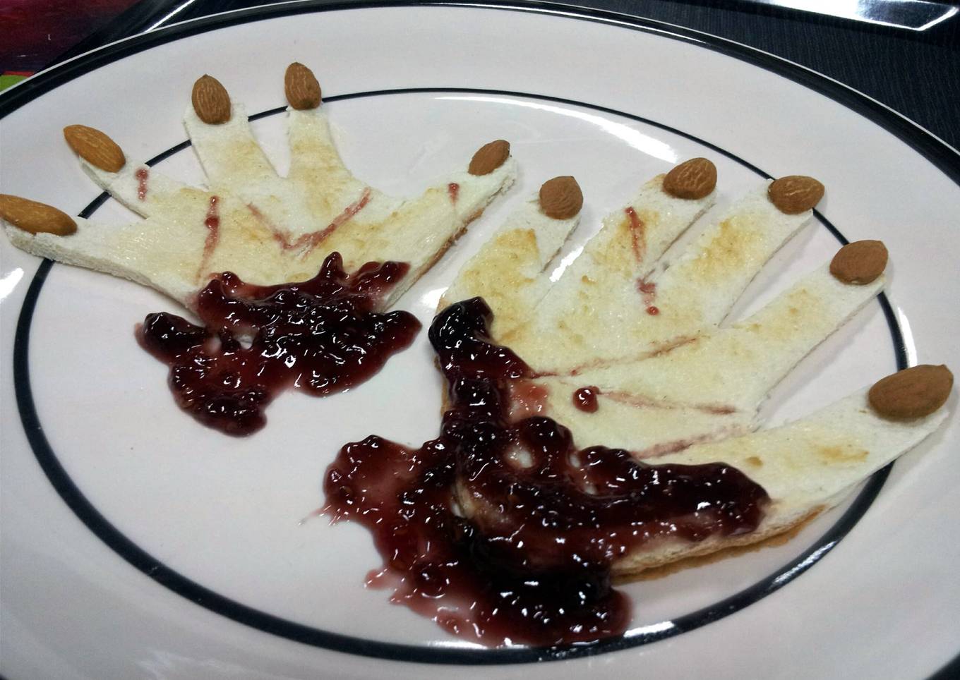 - mold hands and cut draw some line spread some butter nd peanut butterto look pail.stick the almonds on each finger it serves as nail then some jam on wrist serve as blood!!!!
